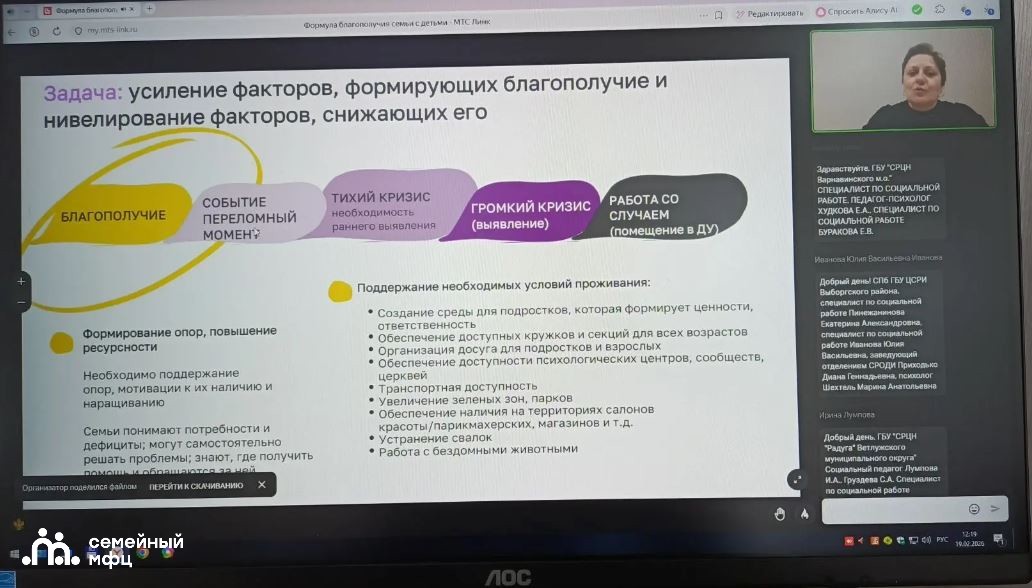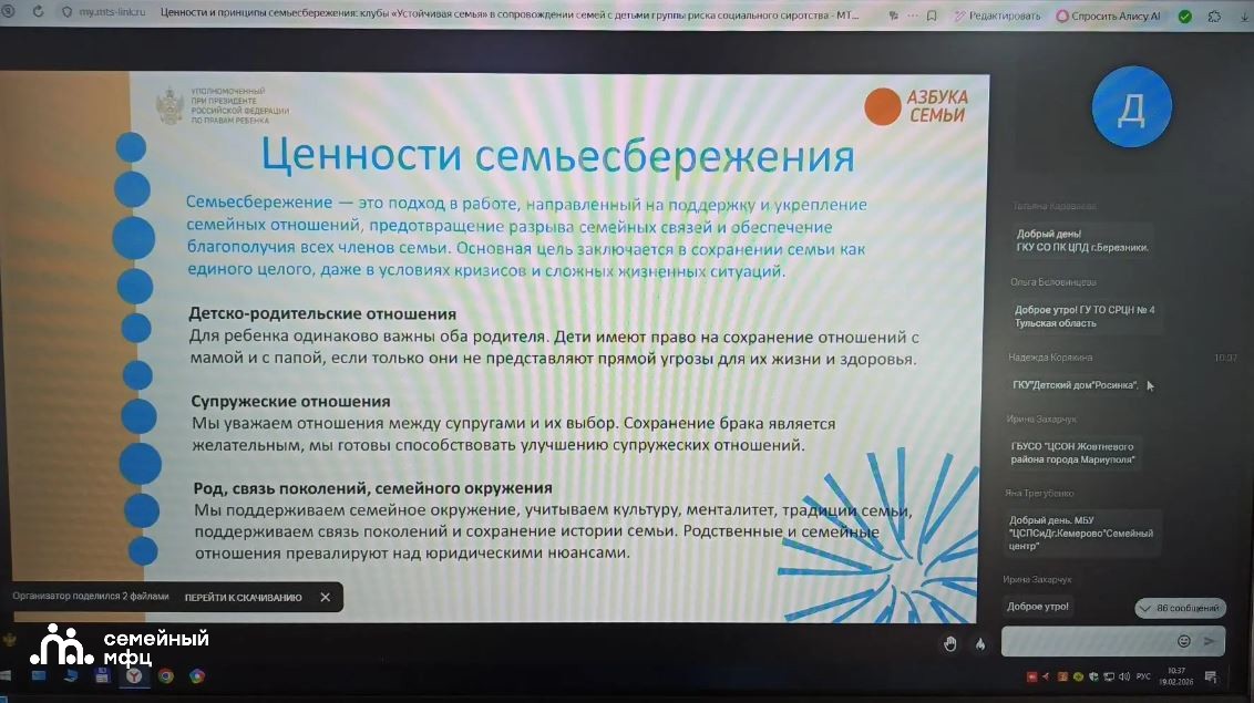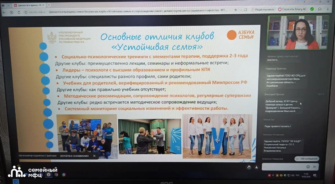 Сотрудники отделения СМФЦ Октябрьского района города Пензы приняли участие в обучающих вебинарах на тему: «Ценности и принципы семьесбережения: клубы «Устойчивая семья» в сопровождении семей с детьми группы риска социального сиротства», «Формула благополучия семьи с детьми» организованных в рамках проекта «Федеральный лекторий» Уполномоченного при Президенте РФ по правам ребенка.